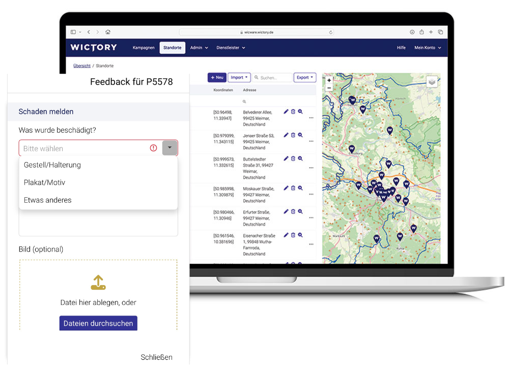 Kein Problem! Über unser intelligentes Online-Tool WICWARE können Sie Schäden ganz einfach melden – egal ob von unterwegs oder zuhause. Unsere Teams kümmern sich dann schnellstmöglich um die Reparatur oder den Austausch. WICTORY versichert die Tafeln gegen Diebstahl sowie Brand- oder Zerstörungsschäden.